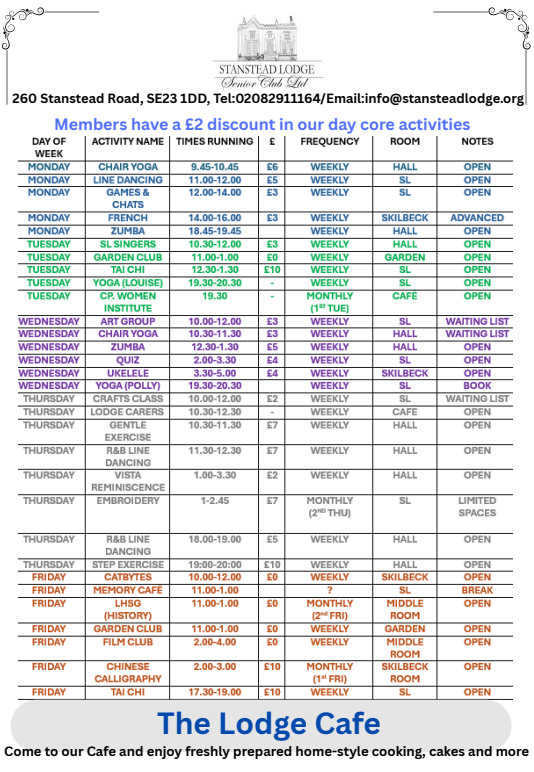 DAY OF WEEKSTANSTEAD LODGE SENIOR CLUB’S ACTIVITY SCHEDULETIMESFEE/