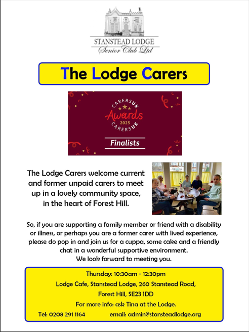We heard the very good news from Wendy and Carolyn that The Lodge Carers who meet every Thursday at Stanstead Lodge have been shortlisted for a national award and we are very proud of them. Well done!